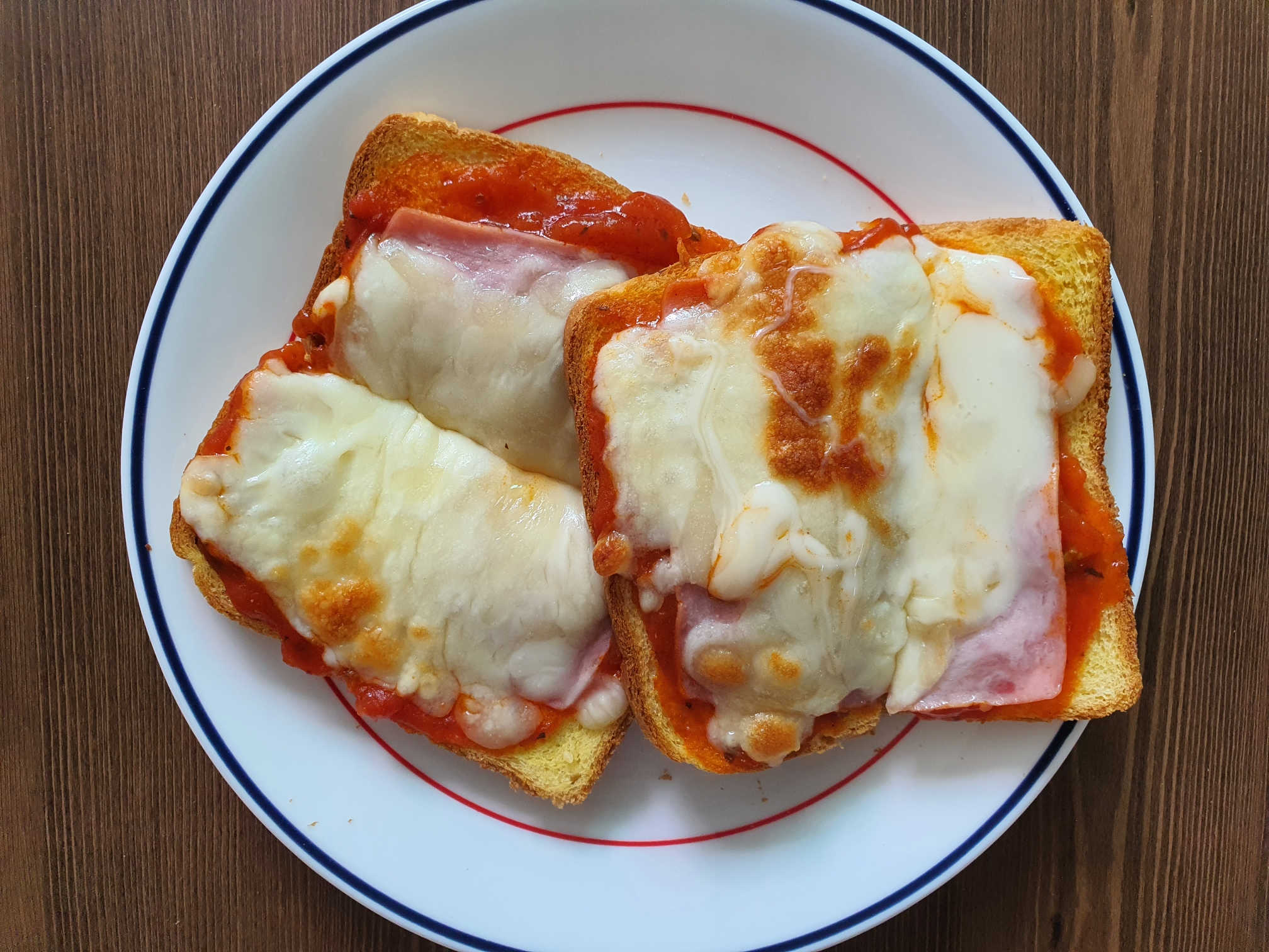 1. 빵위에 스파게티소스를 얇게 펴바르고 위에 햄을 올려줬어요